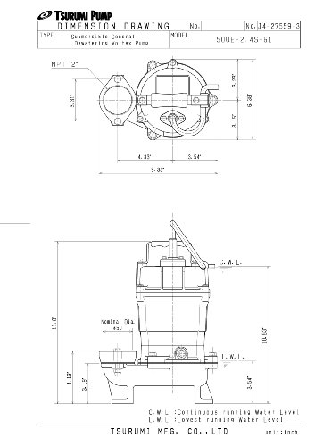 Tsurumi Pump submersible cast iron sump pump with a 2" discharge. Pump rated 4300 GPH. Model - 50UEF2.4S Discharge Bore (in) - 2" HP - 1/2 Weight (lbs) - 35 Cable Length (ft) - 20 Height (in) - 12 1/8 Diameter (in) - 9 1/3 C.W.L (in) - 3 1/2 Features & Benefits - High flow, low head for constant flow applications. - Cast ironl Impeller for maximum durability and maintaining pump performance. - Cast iron pump body - Oil Lifter provides lubrication of the seal faces. (Patent Pending) - V-Ring Seal Protector protects mechanical seal from abrasive particles. .Double Inside Mechanical Seal with SIC faces provides the longest operational life. *** All Tsurumi Pumps come standard with a 2 year warantee from date of purchase.